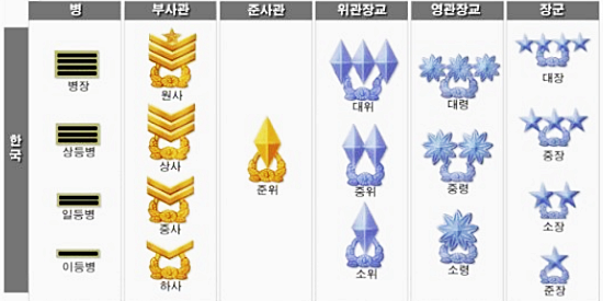 우선 계급을 알아보도록 할게요. 직업군인에는 부사관(하사, 중사, 상사도 있지만, 지휘 계급인 장교급의 직업군인도 있어요. 우리가 잘 알고있는 다이아몬드, 무궁화, 별과 같은 계급이 장교급 군인들이랍니다.