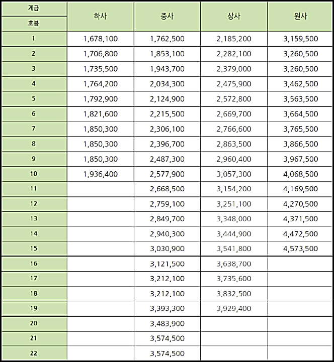 (27호봉까지 있지만 부사관 최대 호봉 월급 기준 끝이 22호봉이기에 추가하지 않았습니다.)